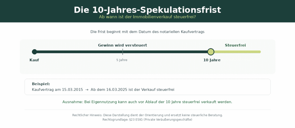 Die Spekulationsfrist beginnt am Tag nach der notariellen Beurkundung des Kaufvertrags und endet exakt zehn Jahre später. Für Immobilienverkäufer ist die präzise Fristberechnung entscheidend – ein Tag kann über steuerfrei oder steuerpflichtig entscheiden.