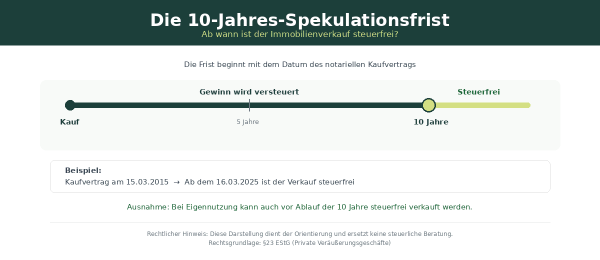 Die zentrale Regel: Liegt zwischen Kauf und Verkauf ein Zeitraum von mehr als zehn Jahren, ist der Gewinn steuerfrei. Maßgeblich ist das Datum der notariellen Beurkundung – nicht die Schlüsselübergabe oder der Grundbucheintrag.